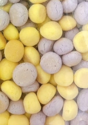 馬鈴薯澱粉(国内製造)、砂糖、水飴、鶏卵、かぼちゃパウダー、紫いもパウダー、食用卵殻粉