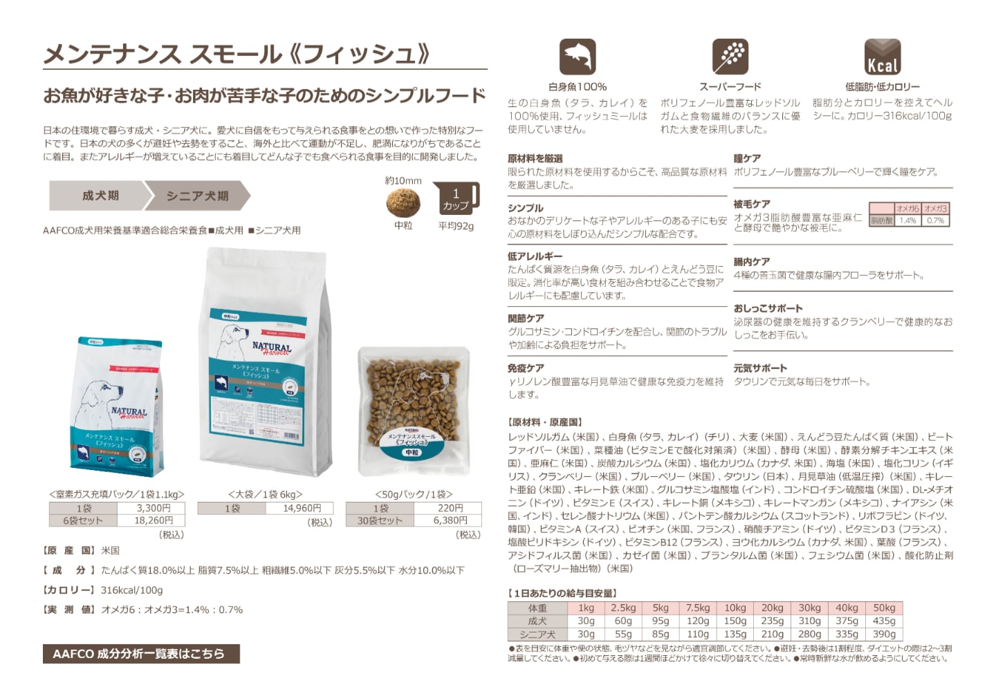 ◇原材料(原材料原産国):レッドソルガム(米国)、白身魚(タラ、カレイ)(チリ)、大麦(米国)、えんどう豆たんぱく質(米国)、ビートファイバー(米国)、菜種油(ビタミンEで酸化対策済)(米国)、酵母(米国)、酵素分解チキンエキス(米国)、亜麻仁(米国)、炭酸カルシウム(米国)、塩化カリウム(カナダ、米国)、海塩(米国)、塩化コリン(イギリス)、クランベリー(米国)、ブルーベリー(米国)、タウリン(日本)、月見草油(低温圧搾)(米国)、キレート亜鉛(米国)、キレート鉄(米国)、グルコサミン塩酸塩(インド)、コンドロイチン硫酸塩(米国)、DL-メチオニン(ドイツ)、ビタミンE(スイス)、キレート銅(メキシコ)、キレートマンガン(メキシコ)、ナイアシン(米国、インド)、セレン酸ナトリウム(米国)、パントテン酸カルシウム(スコットランド)、リボフラビン(ドイツ、韓国)、ビタミンA(スイス)、ビオチン(米国、フランス)、硝酸チアミン(ドイツ)、ビタミンD3(フランス)、塩酸ピリドキシン(ドイツ)、ビタミンB12(フランス)、ヨウ化カルシウム(カナダ、米国)、葉酸(フランス)、アシドフィルス菌(米国)、カゼイ菌(米国)、プランタルム菌(米国)、フェシウム菌(米国)、酸化防止剤(ローズマリー抽出物)(米国)